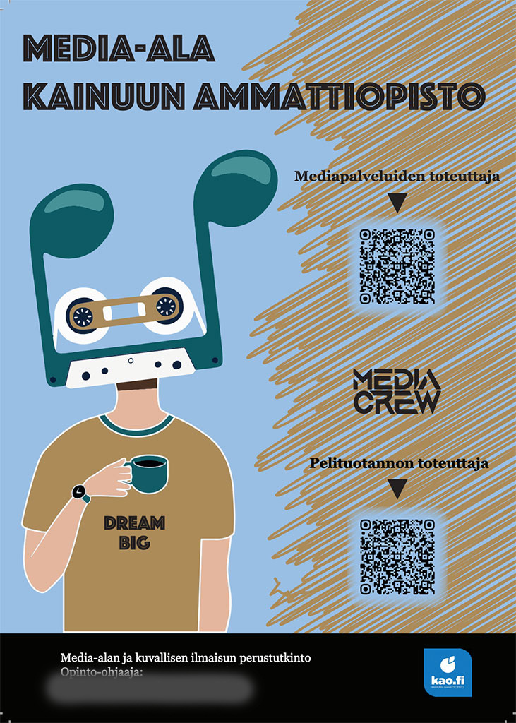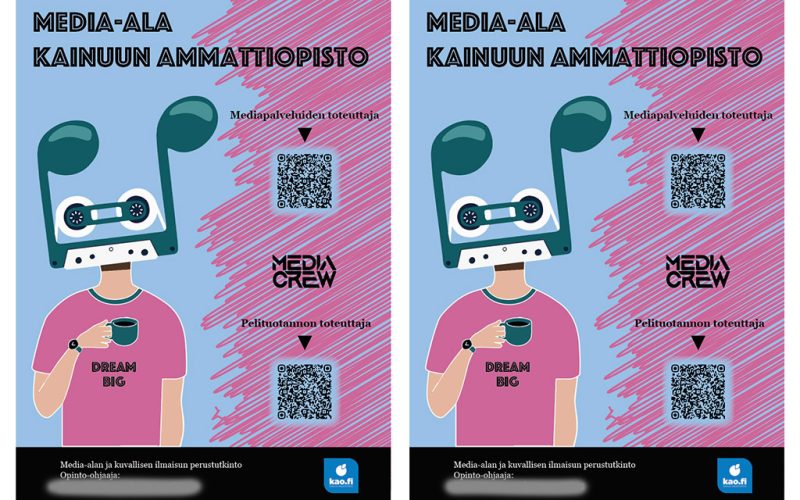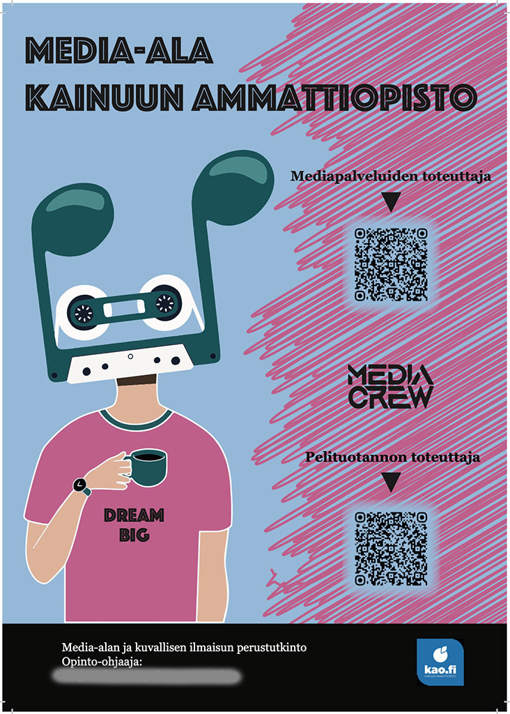 Teimme 8-luokkalaisia varten uudet flyerit, koska entisissä oli vanhentunutta tietoa. Meille annettiin valmiiksi kuvat ja tekstit, jotta varsinkin kuvien valintaan ei menisi niin kauan.